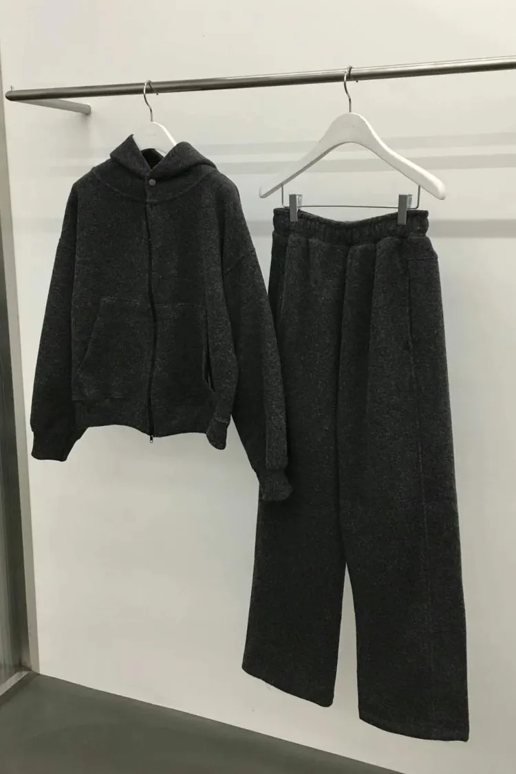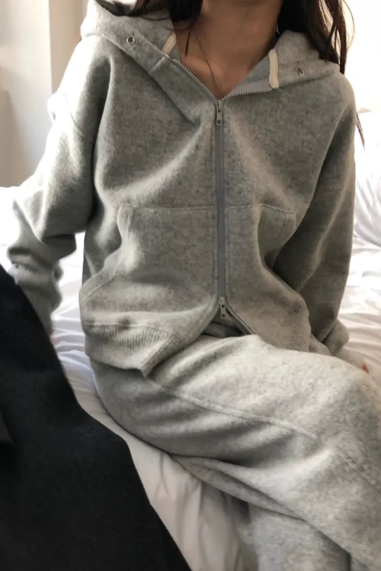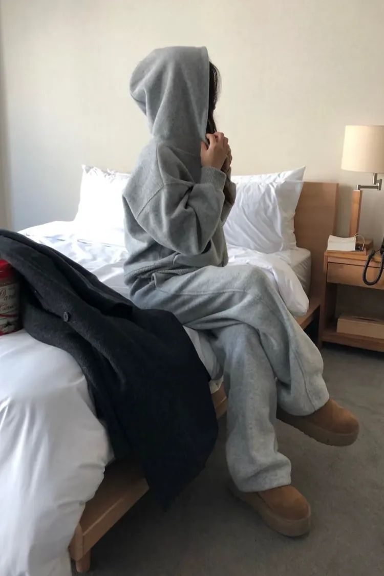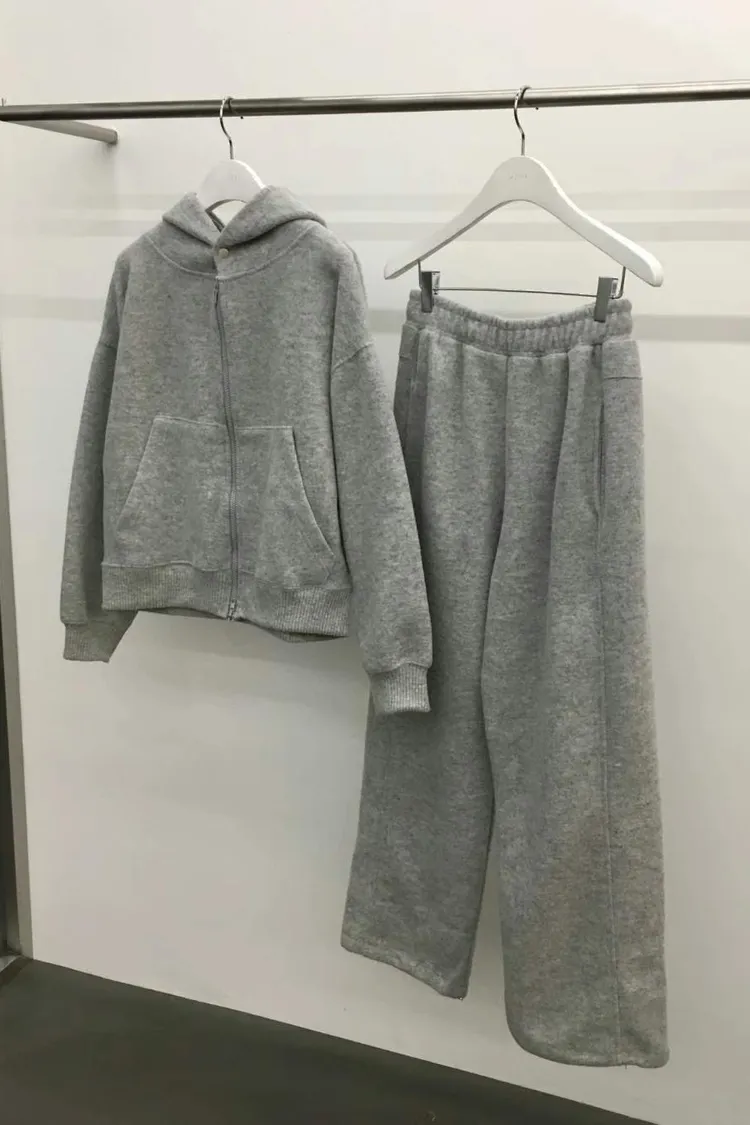 商品描述:此套裝根本是大明星機場私服,好久沒遇到上加下可以做到如此完美的套裝!上身挺微帶廓型,拉鍊雙向,帽不塌,內外材質不同,裡頭超親膚!下身褲子我太驚豔了,這種材質通常穿上澎澎胖胖,但這件穿上是微微香蕉褲的感覺,側身口袋+車線都是往前車,讓這條下身無比修飾!