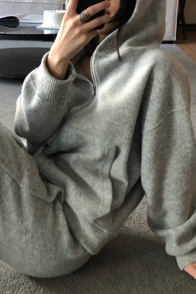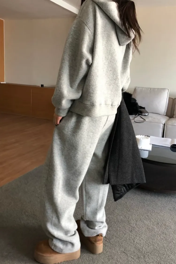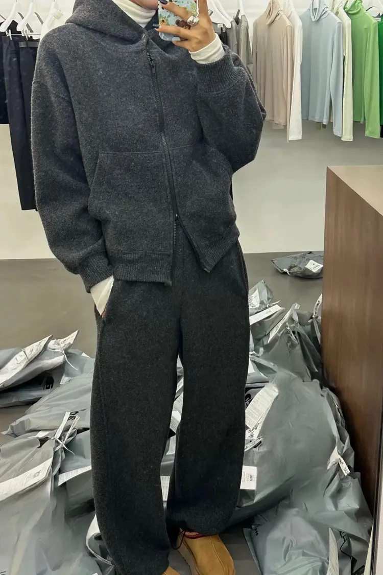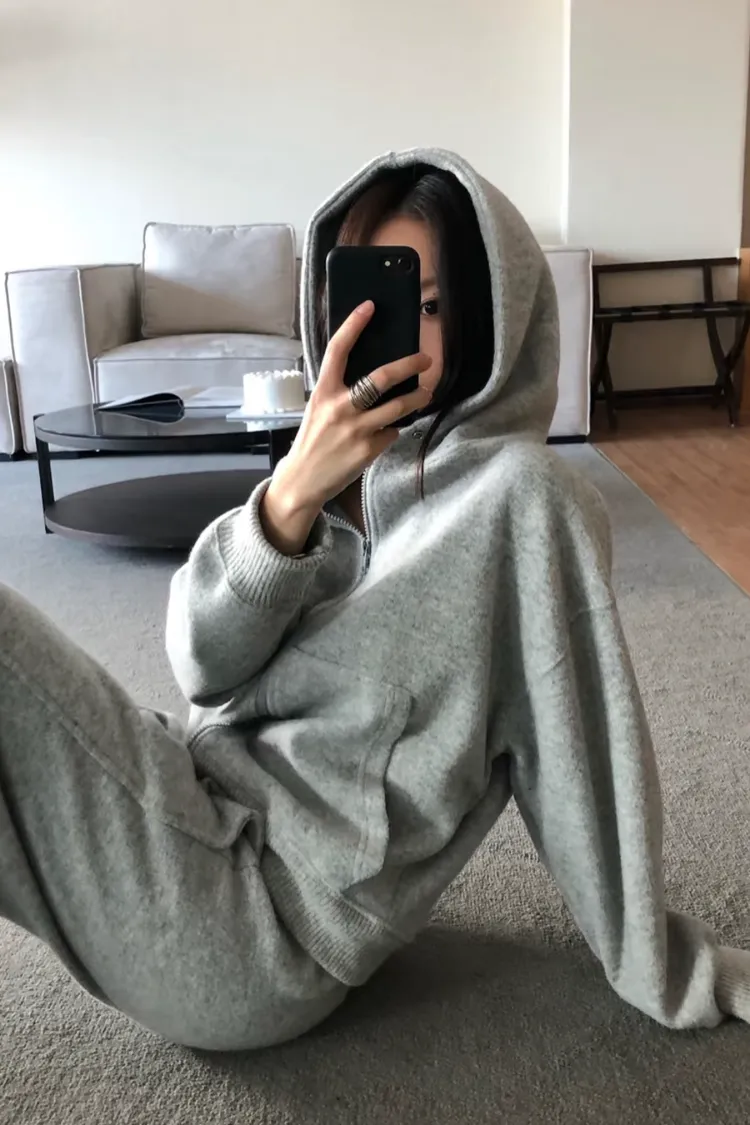 商品描述:此套裝根本是大明星機場私服,好久沒遇到上加下可以做到如此完美的套裝!上身挺微帶廓型,拉鍊雙向,帽不塌,內外材質不同,裡頭超親膚!下身褲子我太驚豔了,這種材質通常穿上澎澎胖胖,但這件穿上是微微香蕉褲的感覺,側身口袋+車線都是往前車,讓這條下身無比修飾!