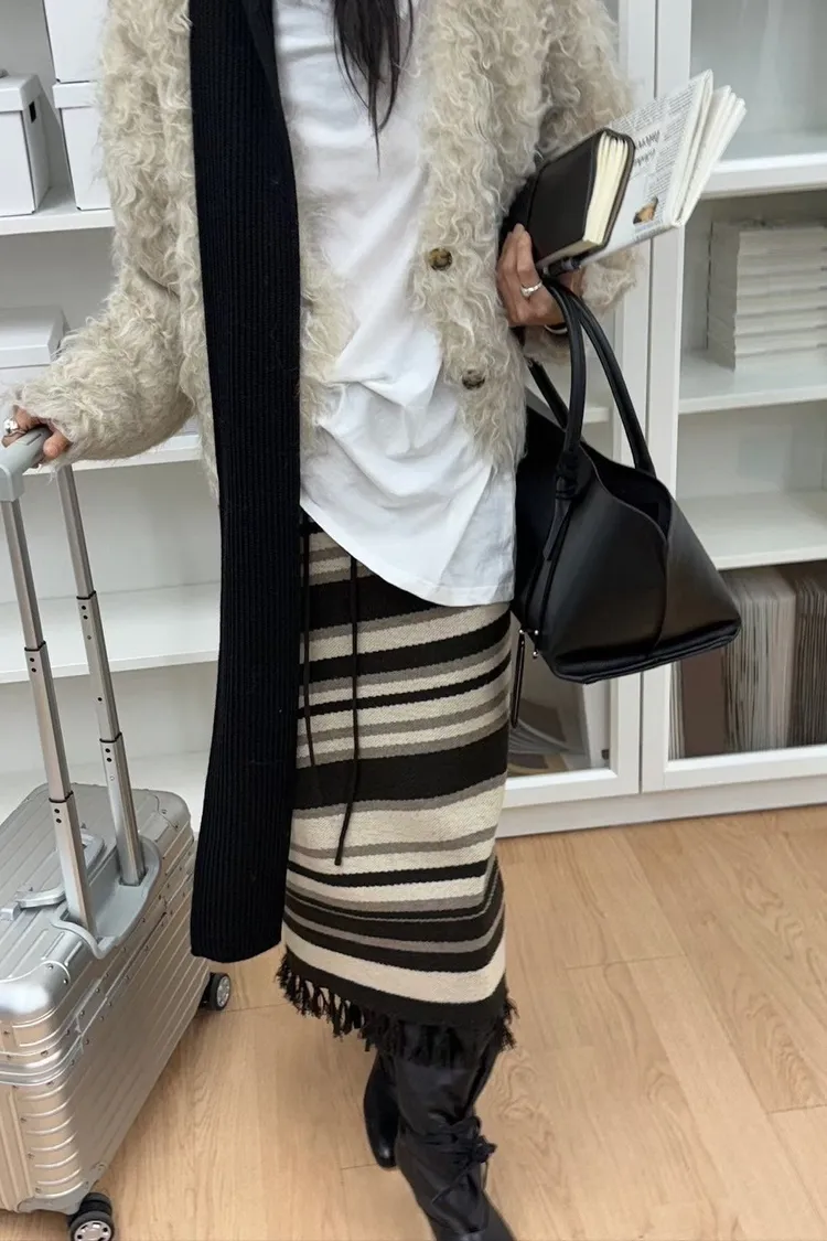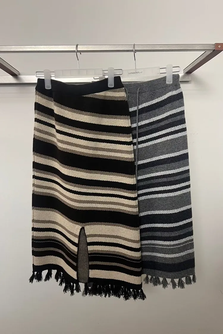 II184-斜紋路線條撞色流蘇彈力裙