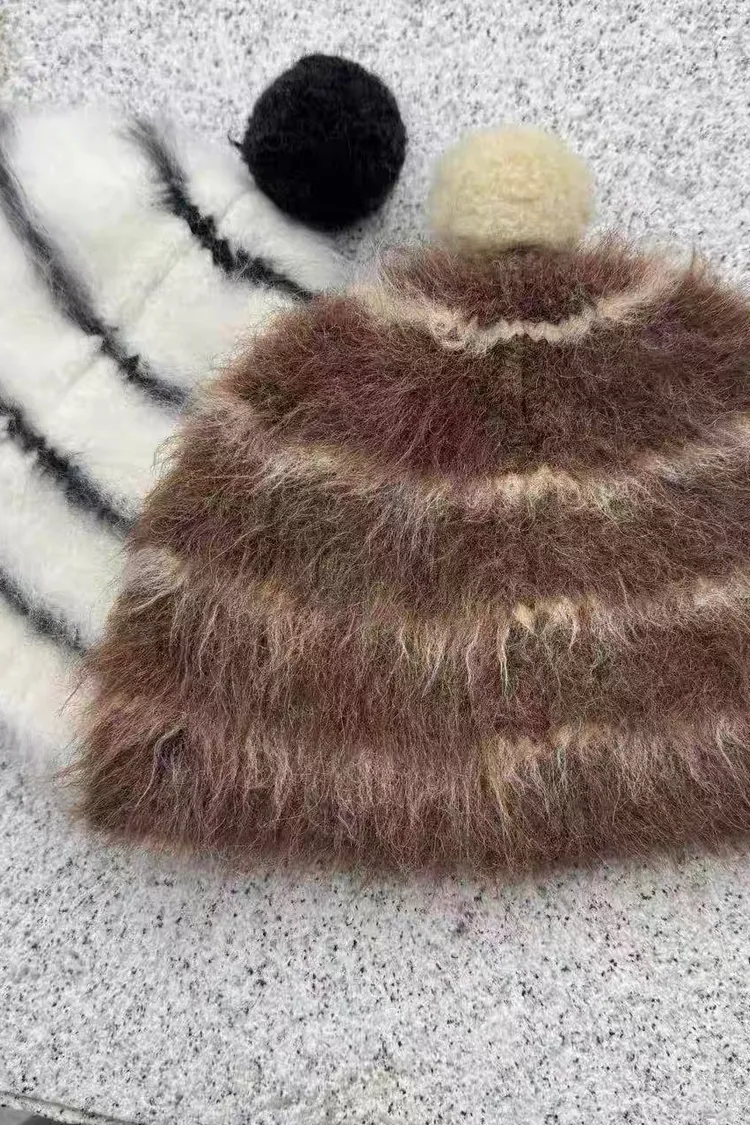 II232-高單特價-毛絨感條紋設計球球毛帽